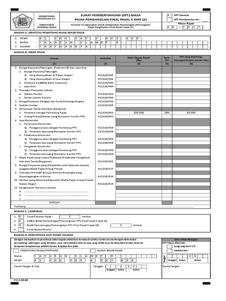 2 SPT Masa PPh Unifikasi sebagaimana dimaksud pada ayat 1 paling sedikit memuat. Pengelolaan bukti pemotongan dalam jumlah banyak lebih mudah karena alur pembuatan yang efektif dan ramah penggunaan user friendly. Membuat bukti potong PPh Pasal 4 ayat 2 melalui aplikasi e-spt PPh pasal 4 ayat 2 melakukan penyetoran PPh Pasal 4 ayat 2 yang telah dipotong tersebut dengan terlebih dahulu membuat kode billing MAP-KJS 411128-403.