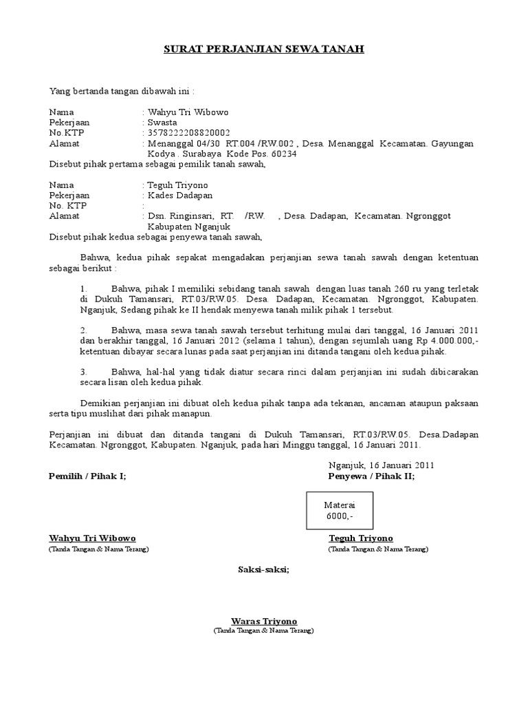 4 Surat Perjanjian Sewa Menyewa Tanah. Perjanjian Pajakan Sewaan Tanah. Demikian setelah keterangan isi jual beli ini.